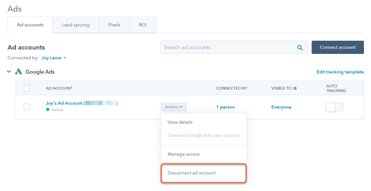 If you want to disconnect your other ad accounts from HubSpot, learn how to disconnect a Facebook Ads or LinkedIn Ads account.