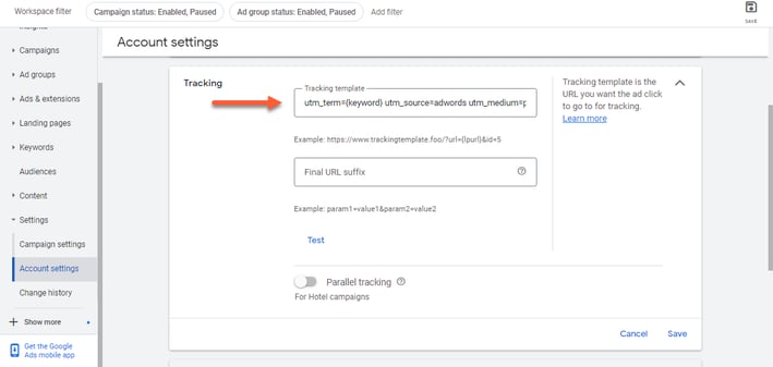 To remove the HubSpot tracking template from your Google Ads account, you will need to remove the tracking parameter from both the account and campaign settings: