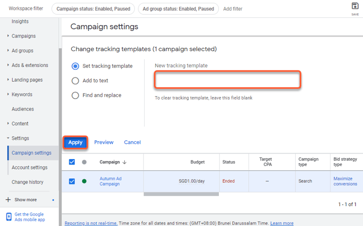 Please note: the New tracking template field may appear blank, even if there is a template present. If the field is blank, you will still need to click Apply to remove an ad campaign-level template.