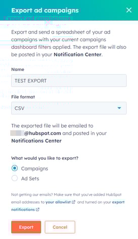 You can export ad campaign and ad set data for the ad accounts you've connected to HubSpot.