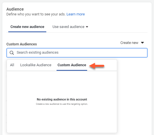 - On the Create New Audience tab, click the Custom Audiences search bar, then click Custom Audience. A list of all existing custom audiences will appear.