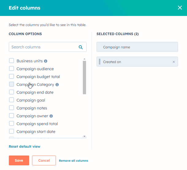 To display a campaign property as a column in the campaigns table:- In your HubSpot account, navigate to Marketing > Campaigns.