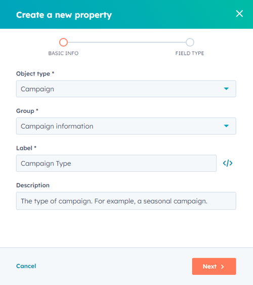 - Label: enter a unique name for the property. This is the name of the property as it appears in your HubSpot CRM, such as within the campaigns tool and in reports.