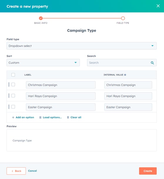 - After setting up your campaign's field type, click Create.