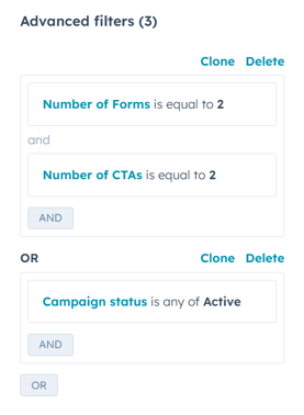 - To add more filter criteria, click AND or OR. Learn more about using AND and OR logic in HubSpot.
