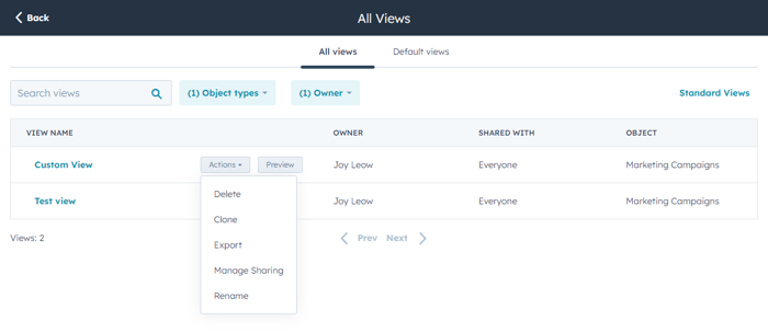 - Hover over a view and click the Actions dropdown menu to: