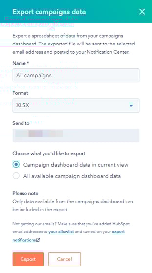 After creating your campaign, if you are a super admin or have export permissions, you can export your HubSpot campaign details to share information with external stakeholders. You can export this data in a csv, xls, or xlsx file from your campaigns dashboard.
