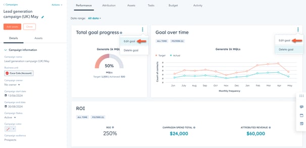 After adding a campaign goal, you can edit the goal, including details such as the goal name, any goal targets, and start and end dates for Single frequency goals. After creating your goals, you can keep track of the goal's progress from your campaign details page.