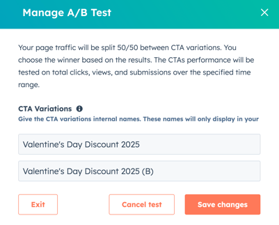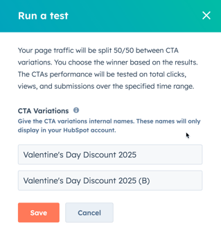 - In the dialog box, you can customize the names for your CTA and CTA variant. By default, the variation will be called [CTA name] (B).