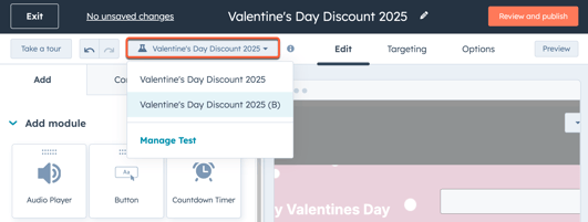 Run an A/B test with two variants of your CTA to measure the effectiveness of different designs and text. After creating and publishing an A/B test, visitors will be split 50/50 for each variant of the CTA.