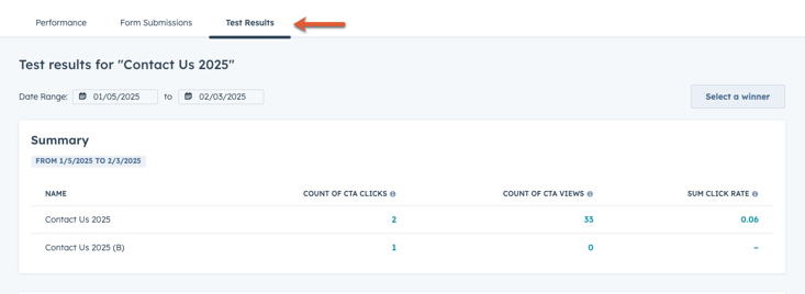After setting up your A/B test, you can review your test results and pick a winning variant. Data for your CTA variant will only appear in the different reports after receiving clicks or views. If there is no data displayed for the variant in the Test Results section, it is possible that the variant has not received clicks or views yet.- In your HubSpot account, navigate to Marketing > CTAs.