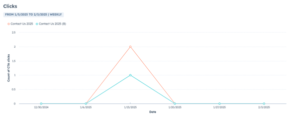 - Clicks: review the CTA clicks over time for each variant. You can hover over a data point in the report to view a breakdown of metrics.