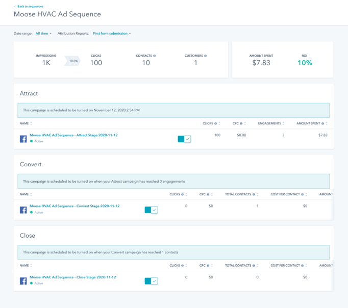 Når du har forbundet din Facebook-annoncekonto med HubSpot, kan du oprette en Facebook-annoncesekvens inde fra HubSpot Ads værktøjet. Du kan designe, målrette og levere en serie af tre annoncer, som hjælper dig med at tiltrække, konvertere og lukke nye kontakter.