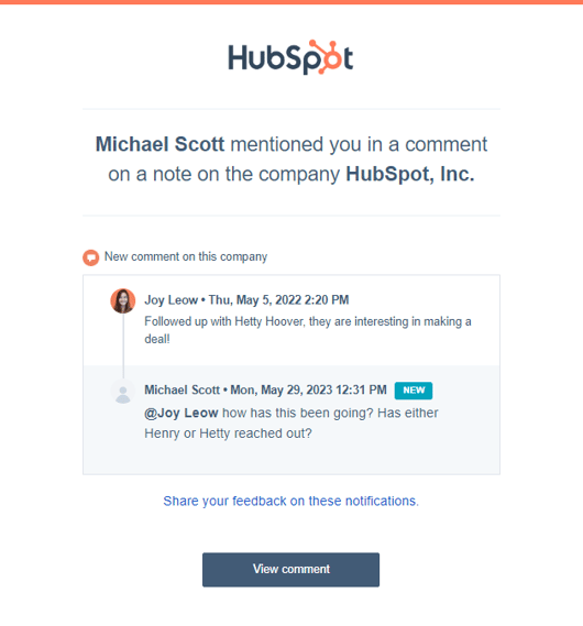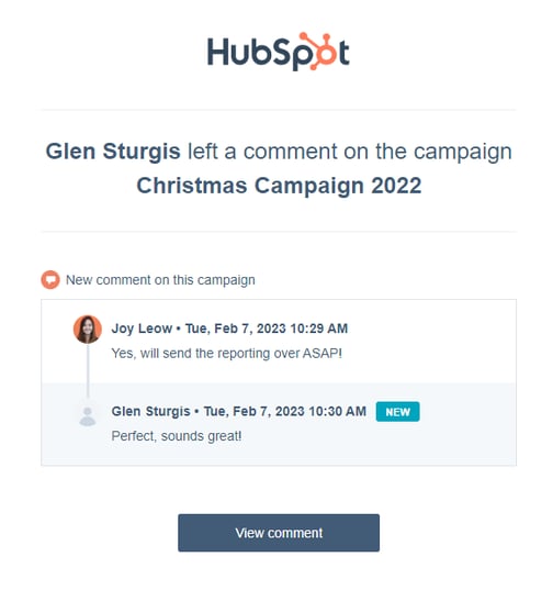 Brug kommentarer til at samarbejde med dit team om aktiviteter som f.eks. noter og opkald i CRM-poster samt indholdsaktiver som f.eks. sociale indlæg eller landingssider. Gennemgå derefter dine kommentarmeddelelser for at få et overblik over kommentarer, der er føjet til aktiver, du måske arbejder på.