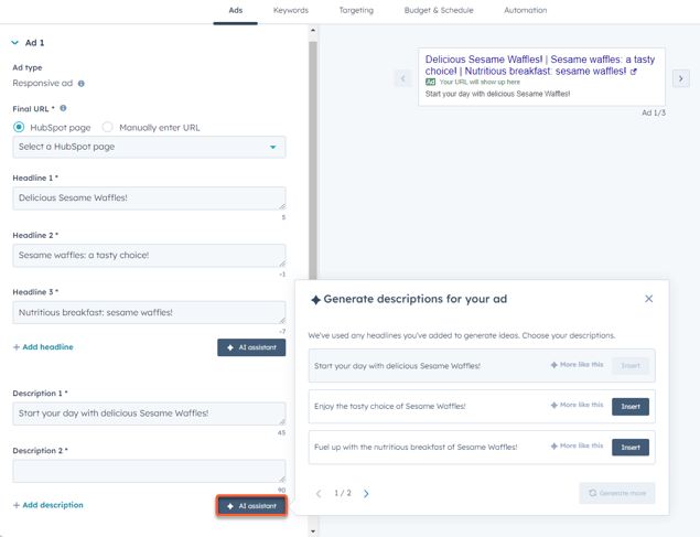 - Klicken Sie im Abschnitt Beschreibung auf AI-Assistent , um Beschreibungen für Ihre Anzeige zu erstellen.