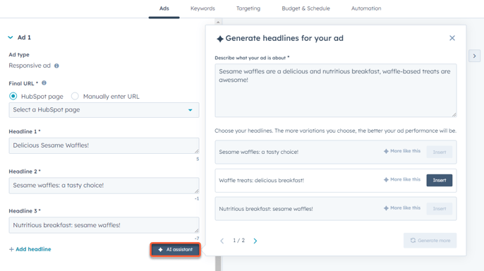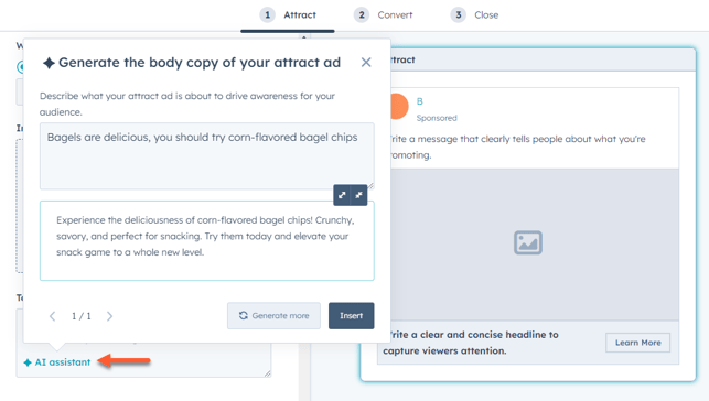 Im Anzeigentool von HubSpot werden die Eingabeaufforderungen in den KI-Assistenten eingegeben, um bei der Erstellung verschiedener Arten von Anzeigenkampagnen automatisch Inhalte zu generieren. Im Allgemeinen können Sie 30 Mal pro Minute und 1.000 Mal pro Tag Inhalte erstellen.
