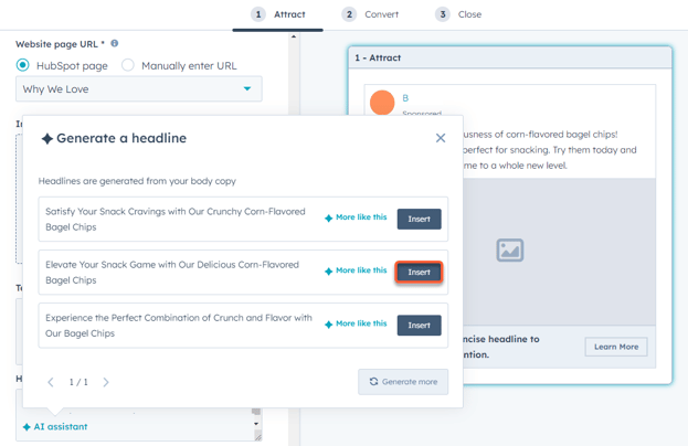 - Klicken Sie oben auf die Registerkarte Attract, Convert oder Close . Klicken Sie auf der Registerkarte Attract unter dem Abschnitt Ad creative auf die Option Create a new ad .