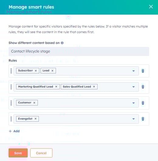- Klicken Sie im linken Bereich auf das Dropdown-Menü Bearbeiten für , um für jede Regel zwischen Standard-Content und Smart-Content zu wechseln.