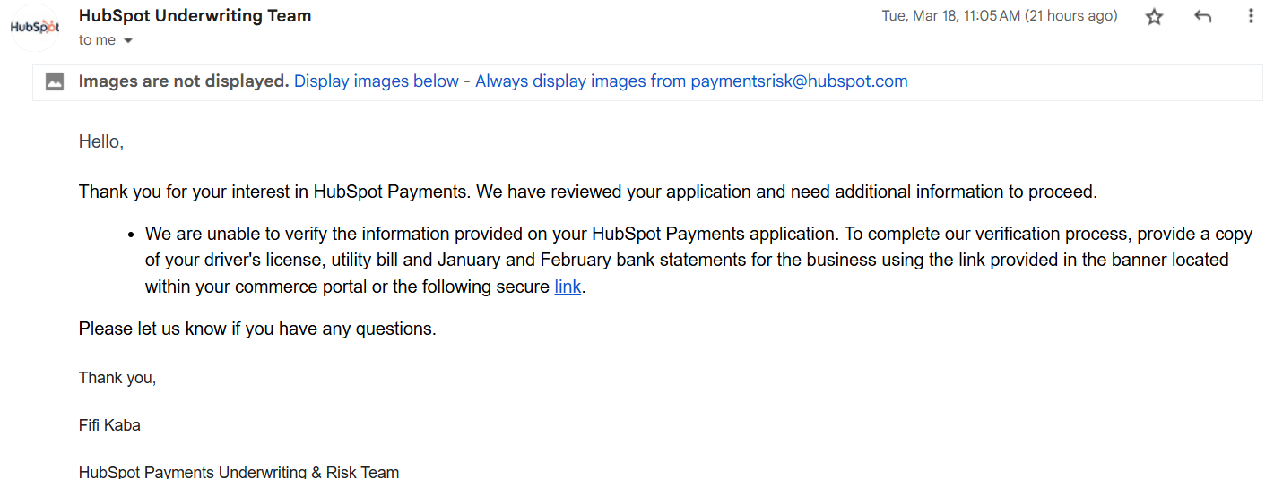 - Sie erhalten eine E-Mail von paymentsunderwriting@hubspot.com mit einer Liste der angeforderten Dokumente und einem sicheren Link zum Hochladen.