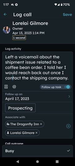 Al final de tu llamada desde tu operador de telefonía móvil o utilizando la herramienta HubSpot Calling, tienes la opción de crear un registro de llamadas.