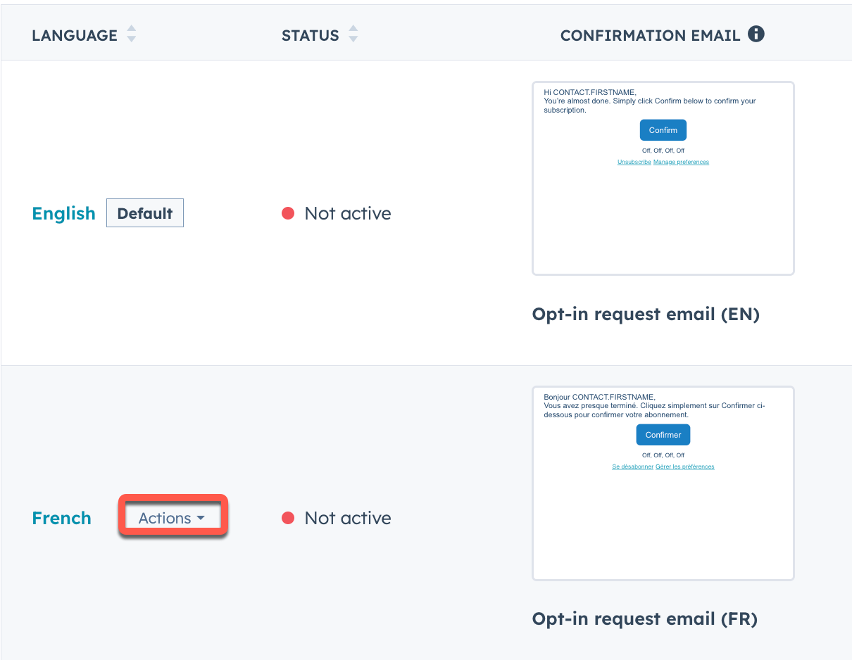 - En la sección Gestión de páginas y correos electrónicos de confirmación doble , pase el ratón por encima de un idioma y haga clic en el menú desplegable Acciones ; a continuación, seleccione Establecer como activo.