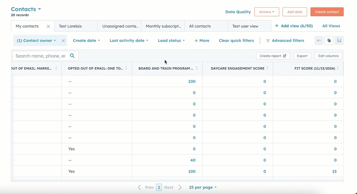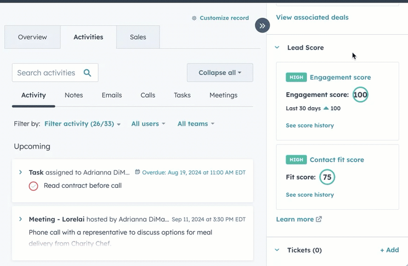 Para acceder rápidamente a una visión general de las puntuaciones actuales y pasadas de un registro, puede añadir propiedades de puntuación como columnas en las visualizaciones de páginas de índice o añadir la tarjeta de puntuación de leads a la barra lateral derecha de sus registros.