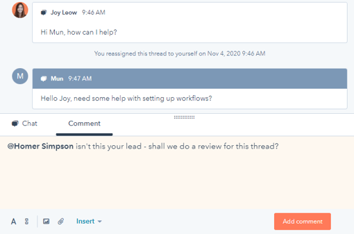 Travaillez avec les utilisateurs de votre équipe pour revoir les fils de conversation ou pour assurer le suivi des contacts en ajoutant des commentaires à une conversation. Ces commentaires ne sont visibles que pour les utilisateurs de HubSpot et ne seront pas visibles pour le contact. Découvrez comment ajouter des commentaires à une conversation.