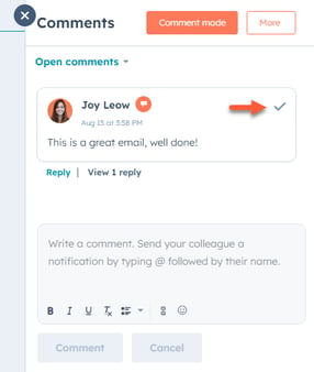 - Pour résoudre un commentaire, cliquez sur l'icône de coche success du commentaire.
