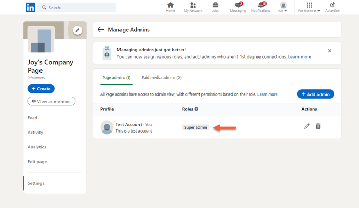 - Dans l’onglet Administrateurs de la page , localisez votre utilisateur LinkedIn et confirmez que vous êtes répertorié en tant que Super administrateur. Si vous n’êtes pas répertorié en tant que Super administrateur LinkedIn, vous devez demander un accès administrateur à la page LinkedIn.