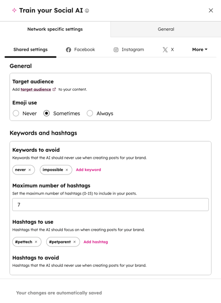 - Hashtags à éviter : configurez des hashtags pour l’IA lors de la création de posts sur les réseaux sociaux. Les hashtags ajoutés ne seront pas utilisés lors de la création de posts sur les réseaux sociaux.