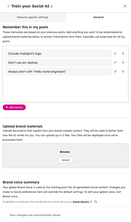 - Charger des documents de marque : ajoutez des documents qui expliquent comment votre marque crée du contenu. Il sera utilisé par l’IA pour personnaliser les publications et le contenu suggérés sur les réseaux sociaux.