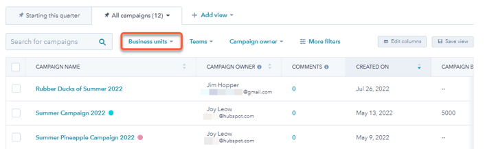- Nel tuo account HubSpot, passa a Marketing > Campagne.