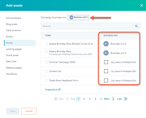 - Dopo aver creato la campagna, rivedere e associare le risorse della stessa business unit. Alcune risorse non possono essere associate alle business unit, per saperne di più sull'associazione delle risorse alle business unit.