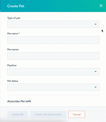 - Nel pannello di destra, inserire i valori delle proprietà e selezionare i record da associare al nuovo record. Imparare a personalizzare le proprietà e le associazioni che appaiono quando si crea manualmente un record.