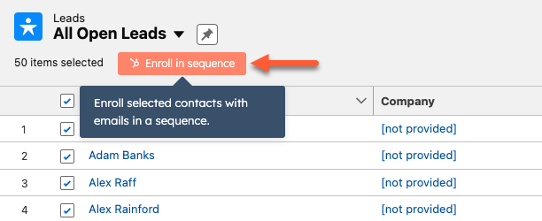 Se avete un abbonamento a pagamento a Sales Hub o Service Hub Professional o Enterprise, potete iscrivere in blocco i contatti o i lead direttamente da Salesforce in una sequenza HubSpot:- Dalle pagine dei contatti e dei lead di Salesforce, selezionate le caselle di controllo accanto ai contatti o ai lead che desiderate iscrivere in una sequenza.