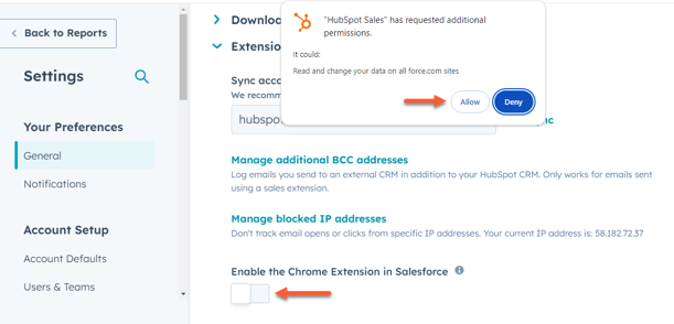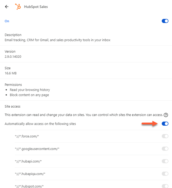 Attualmente non è possibile disattivare l'estensione dalle impostazioni dell'account. Per disattivare l'estensione HubSpot Sales Chrome in Salesforce, rimuovere le autorizzazioni dell'estensione nelle impostazioni del browser: