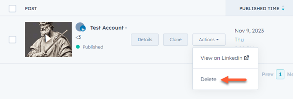 - Passare il mouse sul post sociale da eliminare e fare clic su Azioni. Selezionare quindi Elimina.