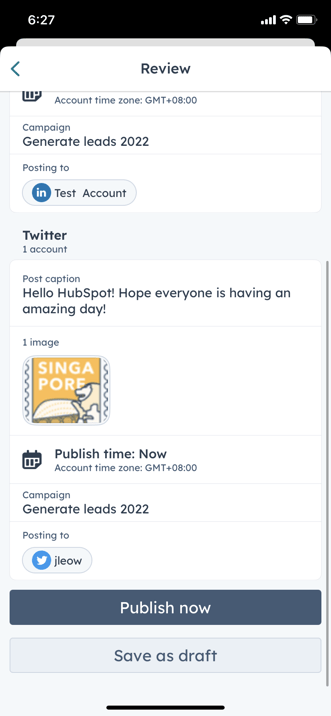 - Dopo aver esaminato i post social, fare clic su Pubblica ora, Pianifica post o Salva come bozza.