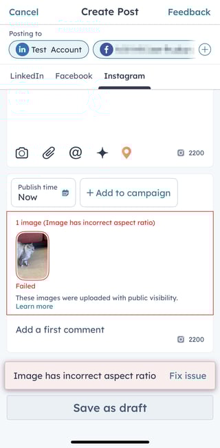 - Quando si personalizza un post di Instagram, se l'immagine non soddisfa i requisiti di rapporto d'aspetto di Instagram, viene visualizzato un avviso: L 'immagine ha un rapporto d'aspetto non corretto. Per risolvere il problema: