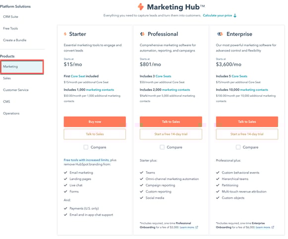 HubSpotの価格ページでは、各サブスクリプションレベルの全製品リストをご覧いただけるほか、製品のトライアルやアカウントのアップグレードも可能です。