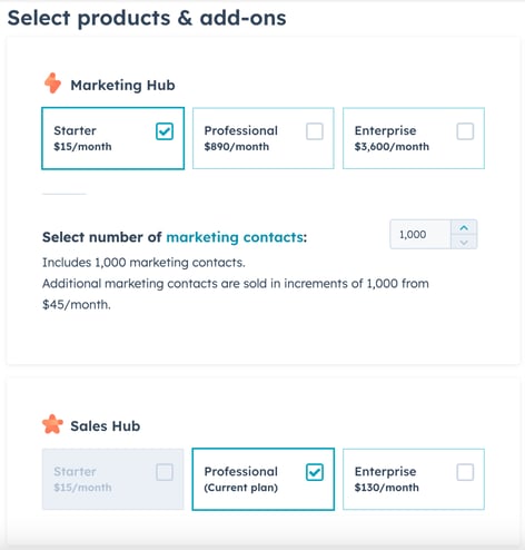 - [今すぐ購入]をクリックすると、注文手続きプロセスが開始されます。画面の指示に従って、購入を完了します。[営業担当者に相談する]をクリックした場合は、HubSpotの営業担当者に、電話またはメッセージでサブスクリプションについて相談できます。