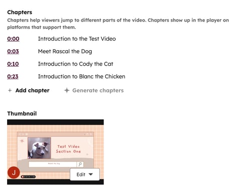- チャプター(Content Hub Professional または Enterpriseのみ):チャプターを追加して再生者が動画の別の部分にジャンプできるようにするには、[ チャプター ]スイッチをクリックしてオンに切り替えます。