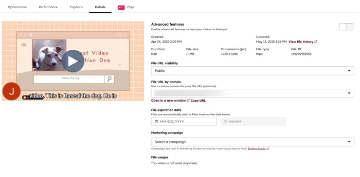 [ 詳細 ]タブで、次のようなファイルの詳細を確認します。- 高度な機能: 動画の高度な機能をオンにするかオフにするかを選択します。HubSpot動画で高度な機能を使用する方法について詳細をご確認ください。