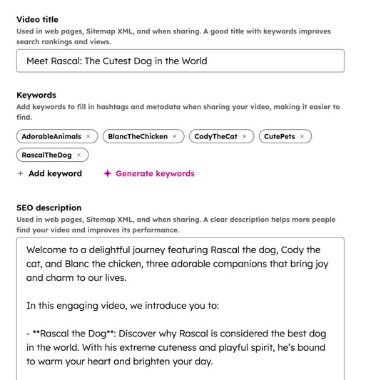 - SEO説明: ウェブページ、サイトマップXML、および共有時に使用するSEO説明 を入力します。動画の内容に基づいてSEO説明を自動的に生成するには、 artificialIntelligence AIアイコンをクリックします。