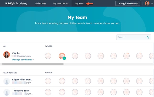 HubSpotアカウントで、自分や他のユーザーのHubSpot認定資格の取得状況を確認することができます。認定バッジや印刷可能な認定証をお探しの方は、認定資格を表示、共有、ダウンロードする方法をご覧ください。 .
