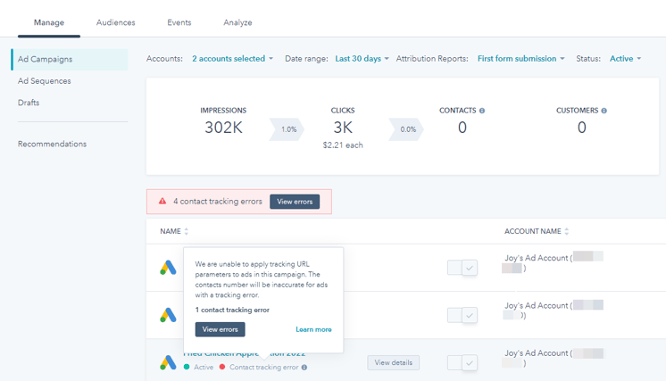 HubSpot에서 광고를 추적할 수 없는 경우 광고 대시보드에 오류가 표시됩니다. 이러한 오류를 검토하고 해결한 후 HubSpot은 15분 이내에 추적 템플릿을 다시 적용하려고 시도합니다.