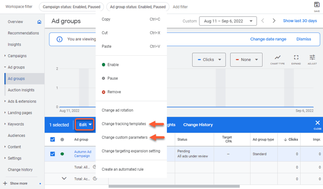 - 추적 문제가 있는 광고가 포함된 광고 그룹 또는 광고 세트를 찾습니다. 광고 그룹 또는 광고 세트 이름을 클릭합니다.