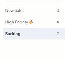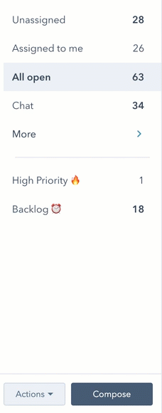모든 사용자 지정 및 표준 HubSpot 보기가 받은편지함의 사이드바에 표시됩니다. 다음 보기는 표준 보기이며 제거할 수 없습니다: