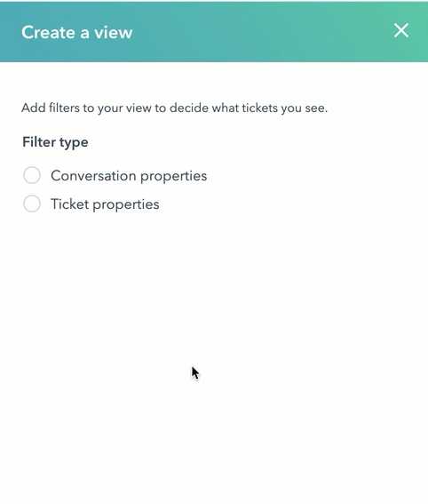 - 필터 유형 섹션에서 필터 옵션을 선택합니다. 기본 티켓 또는 대화 속성뿐만 아니라 사용자 지정 티켓 속성을 기준으로 필터링할 수 있습니다.