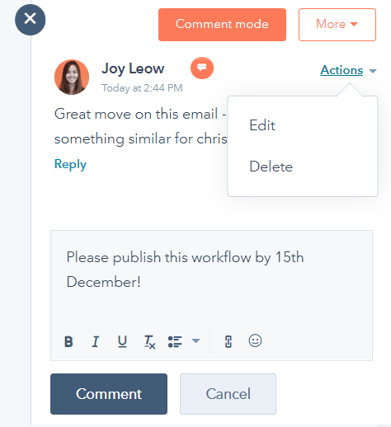 Użyj wersji przeciągnij i upuść paska bocznego współpracy w narzędziu przepływów pracy, aby dodać komentarze i współpracować ze swoim zespołem. Dowiedz się więcej o dodawaniu komentarzy do swoich zasobów HubSpot.